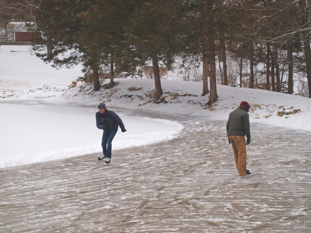 The sky cleared on Wednesday, so now it’s sun on ice— blinding. Papa Jay’s pond is thick enough to drag the snowblower down onto it, and the boys work it like a little zamboni, while my sister and our friends lace up and pull our hockey sticks out from under the johnboat. Then we carve our way between goals, checking each other into snow drifts as we go.