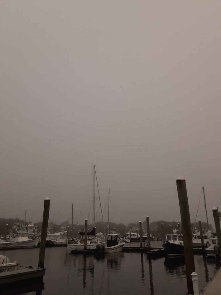 After dinner at a pizza place last night, we drove to Saquatucket Marina and walked the docks. We’d eaten outside, and during dinner, a thick fog had come low over the Cape and shrouded the line where sea meets sky. Darkness fell with it, and in the dull, gray light, the spires of sailboats stood silently. Here and there, a boat creaked or water lapped its sides, but all else was deathly still and cold.