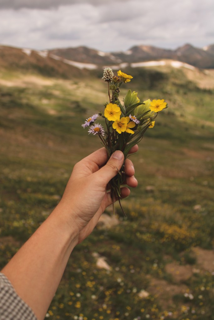 Hiking Loveland Pass and the wildflowers up on the heights: daisies, bluebells, and alpine sunflowers (Joel picking some for Natalie)