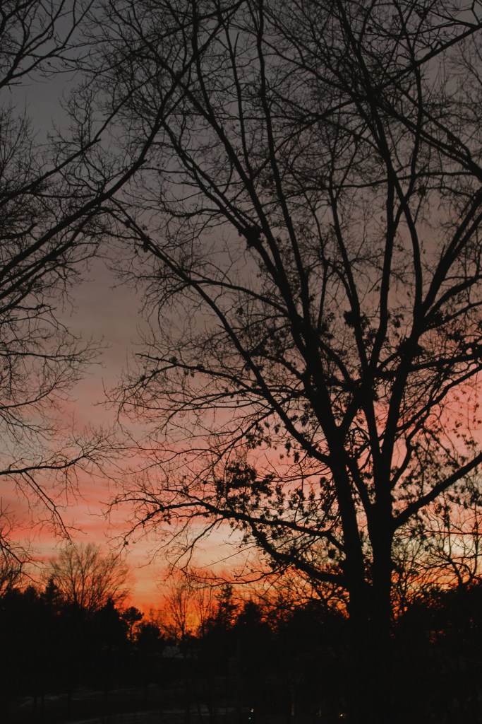 Daylight Savings brought the darkness falling through the trees an hour sooner. We’re eating dinner in it now, and so my evening walks are now nighttime walks, when I need a coat and flashlight. The last of the sun burns low in the bare trees, and the moon rises. Houselights and TV’s flick on, and I’ve never been able to help myself: I like to look inside. There is a strange comfort in the light of a living room window— even if it’s the blue, vacillating light of a flatscreen.