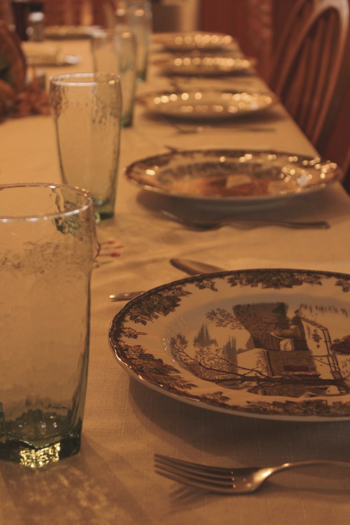 Our own feast — setting the table with Nanny’s Friendly Village dish set, mom in her apron working over the turkey, crumbling pecans for sweet potatoes, kids piled on the couch, cranberry chutney, and pies