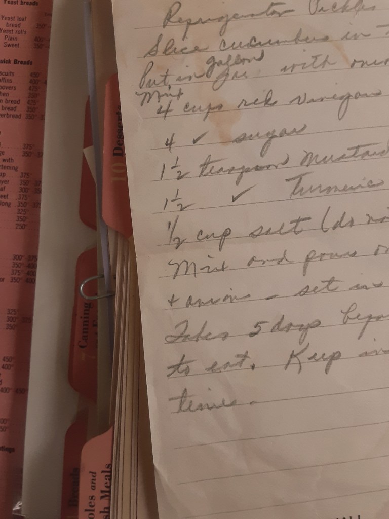 In the same way on my mom’s side of the family, I’ll thumb through my grandma Naomi’s checkered recipe books from the 70’s and can almost smell the pickles and pies. I miss recipe books, when you couldn’t turn a page without Aunt B’s recipe for homemade rolls falling out. I wonder if there is more history in those books than in files of genealogies?