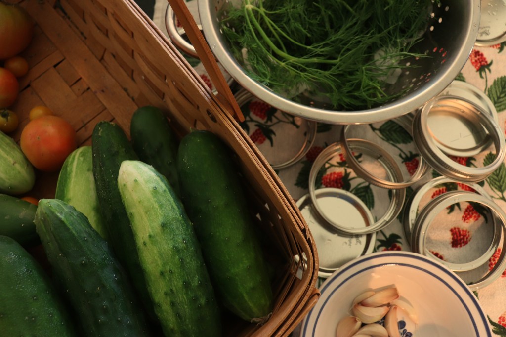 We saved pickling for the hottest afternoons in July, letting the big round thermometer beneath Papa Jay’s sunroom swing well over 90, the humidity souping up like the moss on his pond. It was a big job, with loads of cucumbers to harvest between our garden and Papa’s. Over a few weeks, Mom would save up all the pickings, spreading them out on a table in the basement until the afternoon when we loaded grocery bags of cucumbers into our red wagon and rolled it around the pond.